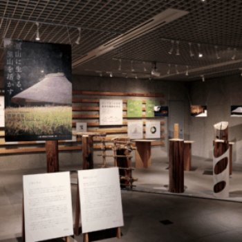 5階MOCTIONショールーム内の展示エリアでは母屋の丸太の大架構が出来上がるまでの過程について、7階特設会場の展示エリアでは母屋を取り巻く里の循環資源と生物多様性のネットワークを可視化した展示を行います。