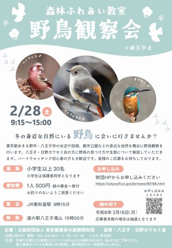 4.内 容:八王子・日野カワセミ会のサポートのもと、身近な森林や水辺に生息する野鳥を観察します。(歩行距離:約7㎞)