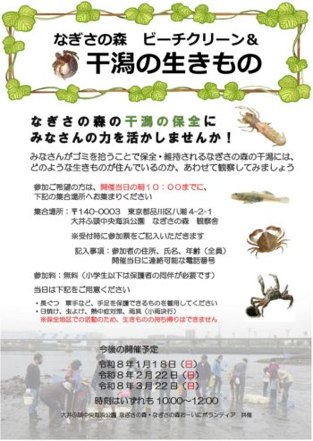 詳細は、下記「【大井ふ頭中央海浜公園】なぎさの森ビーチクリーン干潟の生きもの」ページをご覧ください。