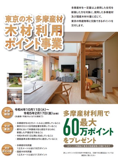 多摩産材を一定量以上使用した戸建住宅を新築した方を対象に、使用した多摩産材及び国産木材の量に応じて、東京の特産物等...