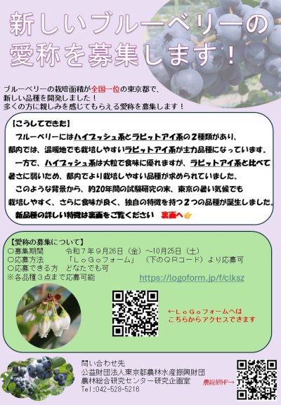 ブルーベリーの栽培面積が全国一位の東京都で、新しい品種を開発しました!多くの方に親しみを感じてもらえる愛称を募集し...