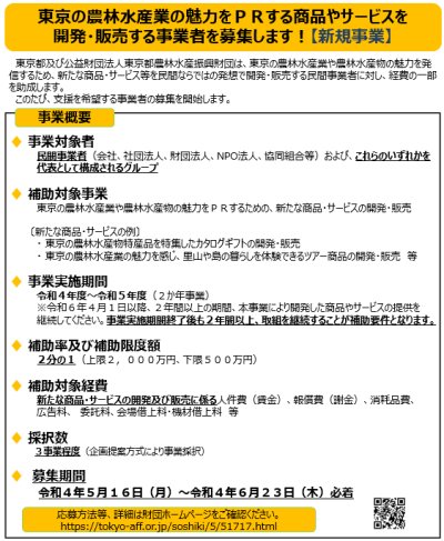 東京都及び公益財団法人東京都農林水産振興財団は、東京の農林水産業や農林水産物の魅力を発信するため、新たな商品・サ...