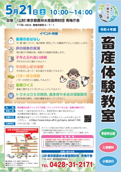 ※受付は終了いたしました。令和4年5月21日(土)、(公財)東京都農林水産振興財団青梅庁舎にて、「畜産体験教室」を...