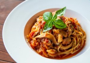 にんにくをオリーブオイルでじっくりとローストし香りを出し、サンマルツァーノトマトとうみかぜ椎茸をふんだんに使ったバジルトマトソースに仕上げました。