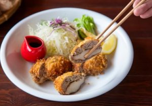 「男メシ食堂」人気メニュー!肉厚でジューシーな「うみかぜ椎茸」の肉詰めフライをご賞味下さい。