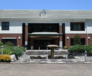 立川庁舎玄関で、杉村先生の虫取り網の長さに参加者はビックリ!