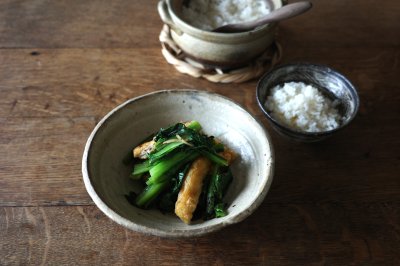 「小松菜、お揚げ、千切りのしょうがをごま油とナンプラーで炒めただけのシンプルさ。でもこの組み合わせが絶妙で、そしてどうしてかごはんにとてもよく合います。」(