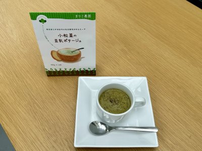 小松菜の栽培過程で出る、間引いた小松菜を使って「小松菜の豆乳ポタージュ」を商品化しました。