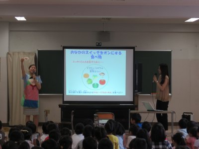 特定非営利活動法人日本成人病予防協会では、平成22年度より、『バナナうんちで元気な子!~生活リズムを整えよう~』と題し、文部科学省、「早寝早起き朝ごはん」全国協議会、公益社団法人日本PTA全国協議会に後援をいただき全国の小学校で出前授業を実施しています。子ども向けのテキストを作成し、うんちのボードやエプロンシアターを使いながら、ダンスを踊ったり、歌ったりと参加型の授業を行っています(東京都内小学校は無料)。
