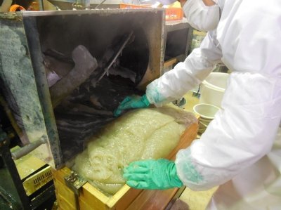 井上食品では、伝統の「バッタ練り」という方法で、すりおろしたコンニャクを羽の着いた機械で練って成型器に流し込み製造しています。