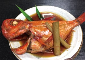 式根島近海で獲れた新鮮な金目鯛を使用した一品。じっくり時間をかけ仕上げる煮付けは、おいしいこと間違いなしです。