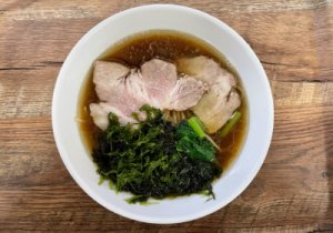 三宅島でとれた地魚のアラを贅沢に使ってダシを抽出した、旨味あふれる醤油ベースのラーメン。その時々によって魚種が変わるため、スープの風味が毎回ちがうのも楽しみのひとつです。明日葉と島のりをトッピングし、三宅島の味覚をたっぷりと味わえる一杯に仕上げました。