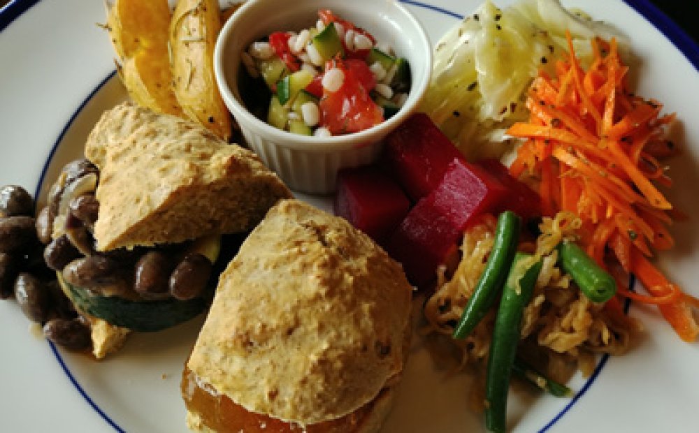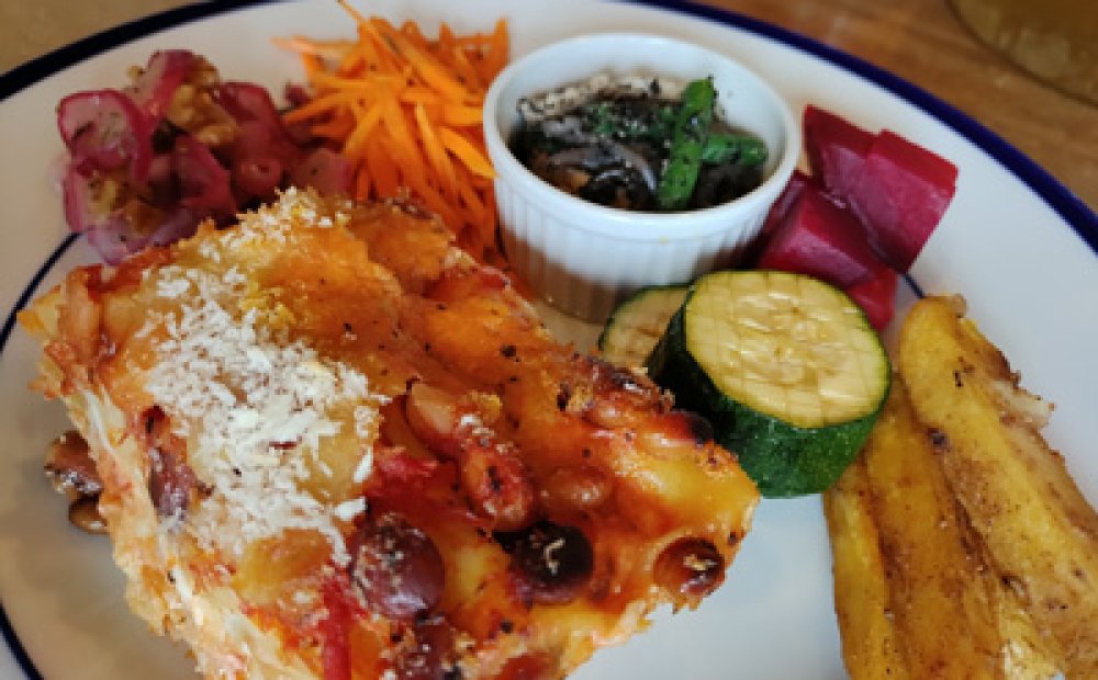契約農家さんの採れたて野菜を使ったスープ、メイン、野菜の副菜5種ほどのベジタリアン日替わりランチ。