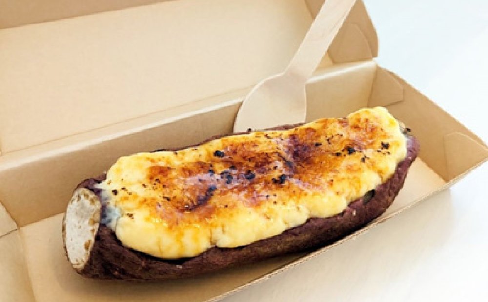 様々なメニューに使用している自家製カスタード、サツマイモを使用したケーキに東久留米市産の柳久保小麦を使用している。