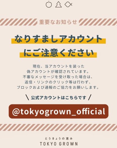 TOKYO GROWN公式インスタグラムの偽アカウントにご注意ください。