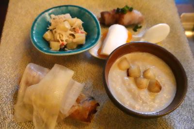 比嘉シェフが産地を訪れ、命の安全をろうそくの火で確かめながら入室する「穴室(あなむろ)」で感じたもの。そして、その感動を株元から根っこまで余すことなく表現した特別な一皿。