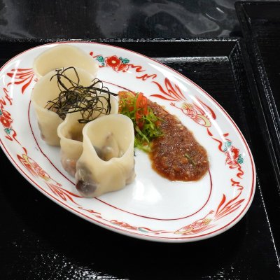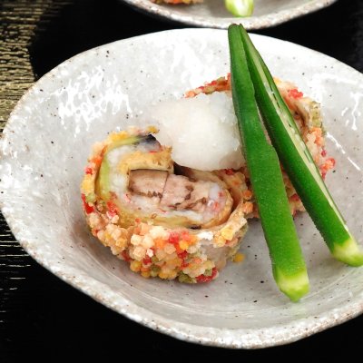 寺島ナスの「なすの巻物風 湯葉包みあられ揚げ」