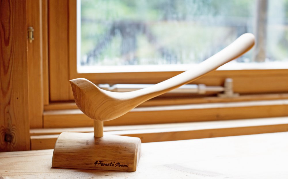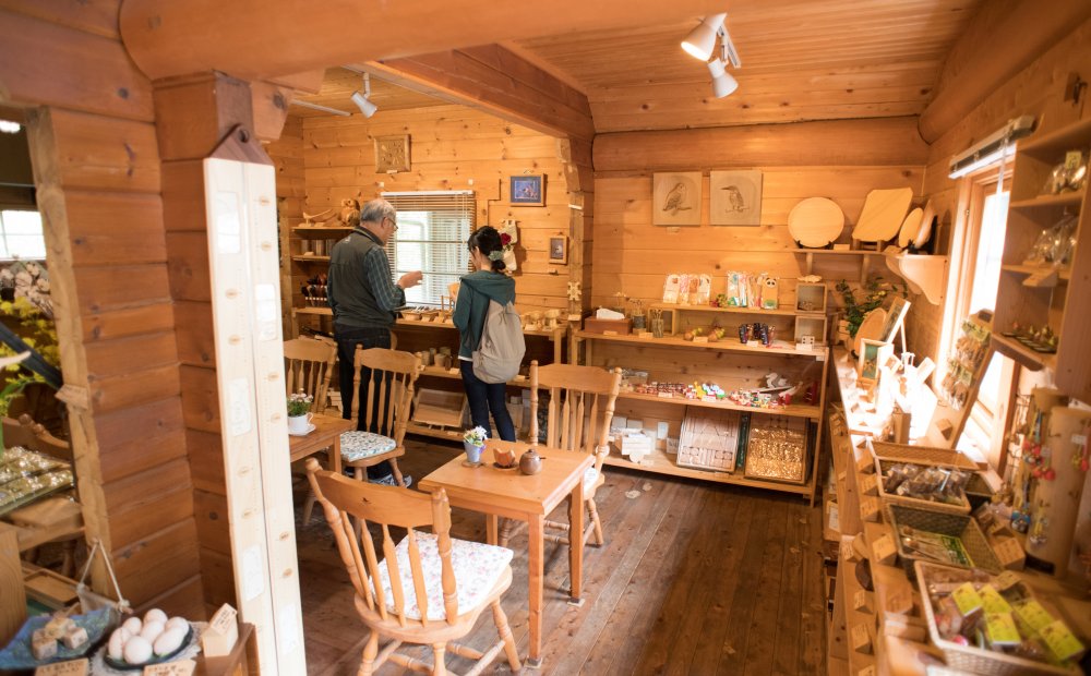 奥深い森の中にある注文家具の店。地元のヒノキにこだわったジャムスプーンやバターナイフなどの木工品が出迎えてくれます。オーナー夫妻の温かさが伝わってくるような木の香あふれる店には、カフェスペースも併設しています。