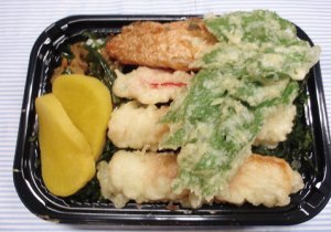 式根島産の明日菜の天ぷらや、郷土料理の自家製たたき揚げなどが乗った、当店1番人気のお弁当。ご飯の上の磯海苔が、島を感じさせる一品です。