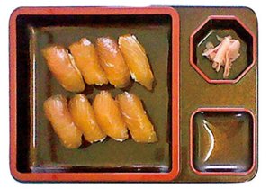 明治中期から続く伝統料理。サワラなどの白身の魚を醤油ベースのたれに漬け込んだ「づけ」のにぎり寿司。わさびではなく、からしを付けていただきます。船内夜食にも最適。