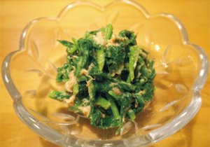 島で収穫される明日葉をさっと湯がき、シーチキンとマヨネーズで和えた一品です。