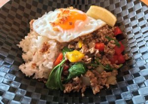 三宅島産の明日葉と青唐辛子でアレンジしたガパオライスや旬の野菜を使ったパスタ、近海の魚の漬け丼などを日替わりで提供しています。