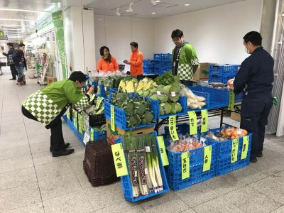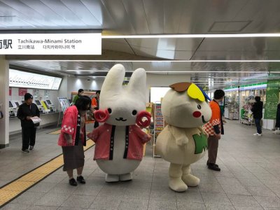12月23日(日)、多摩都市モノレール立川南駅構内で開催されたリニューアル完成記念イベント「たまモノFUN」に、JA東京みどり様と一緒に東京都農林水産振興財団としてブースを出展させていただきました。当日は、るるぶ情報誌と多摩産材のコースターの無料配布や、東京立川産の新鮮野菜の直売が行われ、立川市キャラクター「くるりん」とJA東京みどりキャラクター 「みーどりん」もお祝いに駆けつけ、終日賑やかなイベントとなりました。