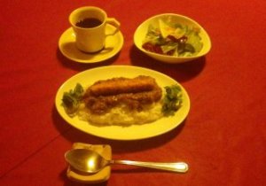 カレーライス、サラダ、食後のドリンクのランチです。神津島でとれた魚をダシに使ったカツカレーをどうぞ。