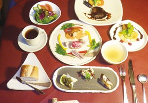 オードブル、スープ、サラダ、魚料理、メイン、デザート、食後のドリンクのディナーです。島でとれた魚の燻製や地野菜のサラダ等、多様な方法で島の味覚を提供します。