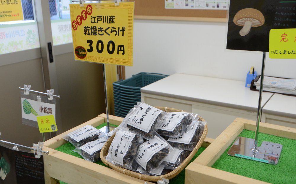 江戸川産の新鮮野菜を販売しています。小松菜は江戸川が発祥の地。本場の小松菜や季節の野菜をお求めいただけます。また、江戸川産のきくらげも人気です。午前中でほぼ売れ切れてしまいますので、お早目にお越しください。