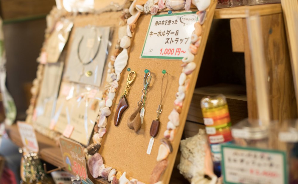 手作りのアクセサリーやオリジナルTシャツ、アカギなどの小笠原の自然素材を使ったお土産、自家菜園で採れたオリジナル島ハチミツ等を取りそろえております。