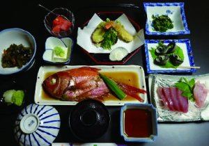 明日葉の天ぷら・ナムル・磯ぶきの岩のりいため煮・金目鯛の煮付・地魚の刺身・いせも(シッタカ)の塩ゆでなど、島の食材を使用してお料理しています。
