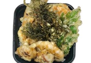 当店おみやげ人気NO.1の島のりを2層に入れた御飯の上に、明日葉天とちくわ天をのせています。