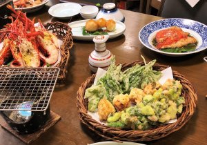 (メニューの例②)金目鯛の煮つけ、伊勢海老(※)、じゃがいもの団子、揚げ物盛り合わせ等