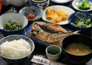 朝によく合う近海で獲れたアジの干物、明日葉の胡麻和え等の和食メニューの一例