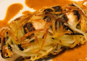 ■(メニュー例②)沖メジナの細切りポテト包み焼き、地魚の裏漉しスープのソース