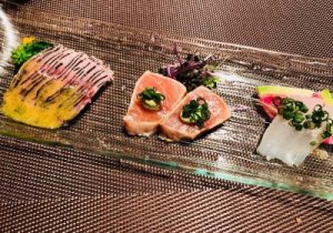 ■おまかせコース (メニュー例①)地魚のカルパッチョ(その日の仕入により内容が変わります)サビのせごし、マカジキの焼き霜仕立て、赤イカ