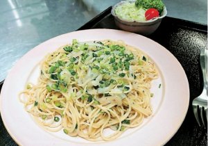 ハンバは地元の呼び名で、学名は「はばのり」といい、冬の西風が吹くと岩につく岩海苔です。ツナも入れハンバとの触感が絶妙にマッチして、まろやかな風味に仕上がっています。サラダも付きます。