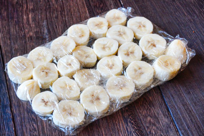 ② バナナは皮をむいて輪切りにし、ラップまたは保存袋に入れて冷凍庫で2時間以上凍らせる。