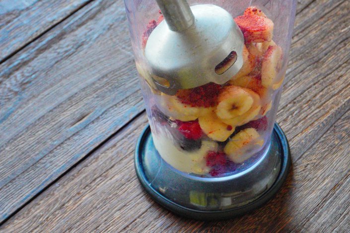 ③ ミキサーに水切りヨーグルト・冷凍ミックスベリー・冷凍バナナ・ビーツパウダーを入れ、なめらかになるまで攪拌する。