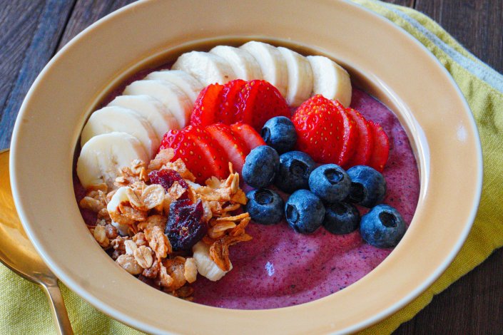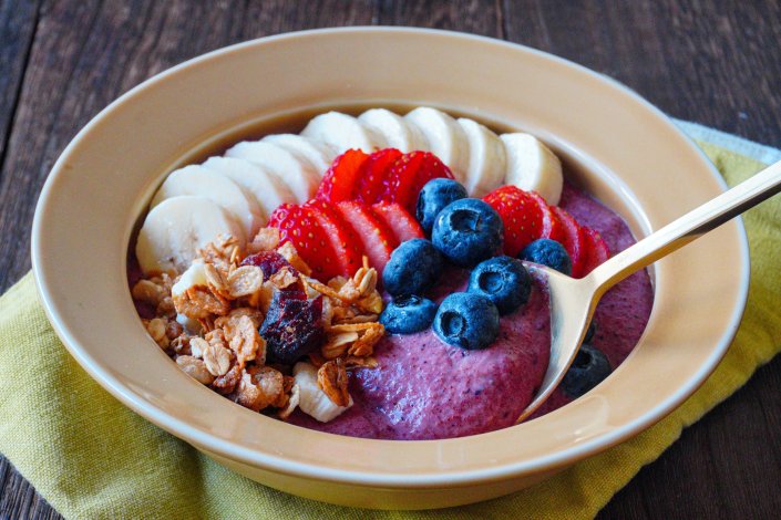 ④ ボウルに盛りつけ、好みのフルーツやグラノーラをトッピングする。