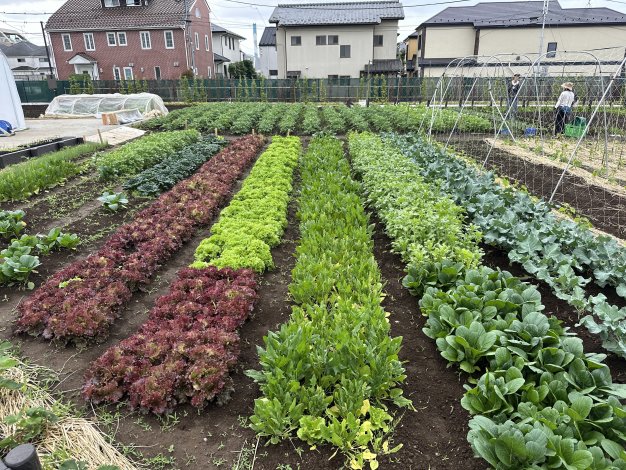 4月に種まきや定植を行ったリーフレタスやホウレンソウなどの葉物野菜が順調に育ち、5月にはカラフルな野菜畑に成長しました。