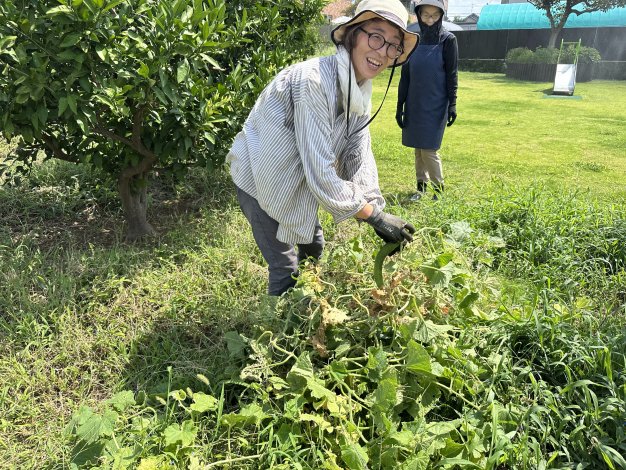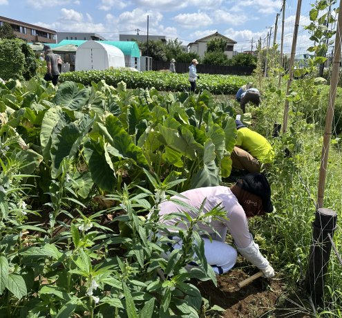 これだけの人数がそろうと、夏野菜の後片づけも周辺の草取りもぐんぐん進みます。おしゃべりをしながらの作業は、まるでレジャー感覚で楽しんでいる様子でした。