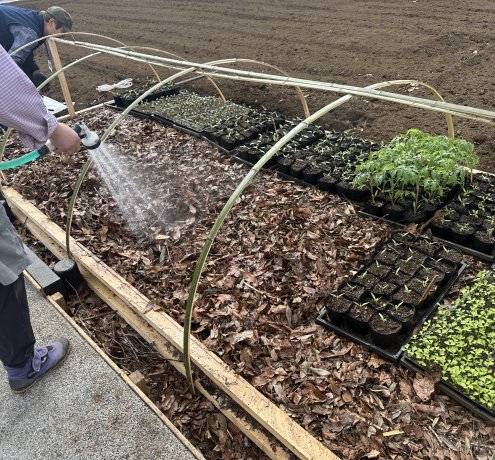 苗床もスタッフの手づくりです。「踏み込み温床」と呼ばれ、下に敷き詰めた落ち葉堆肥の発酵熱で種の発芽を促す仕組みになっています。