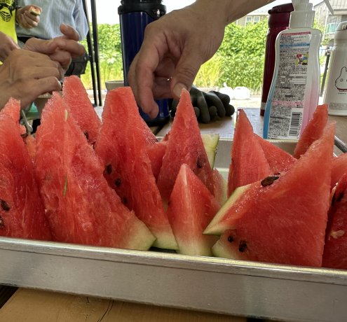 作業のあとはテントの下でスイカを食べて水分補給。桜丘農業公園の農作業ボランティア体験の皆さんと一緒に。