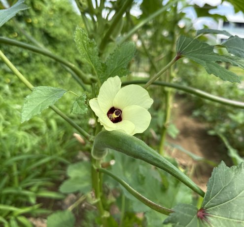 (写真左)オクラの花。(写真右)ごほうびのスイカも畑の収穫物。
