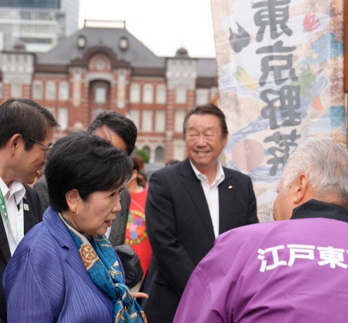 知事は「東京の生産者が都心で直接消費者とつながれるこの場は、非常に意義深いものですね」と語り、活気あふれるマルシェの雰囲気を楽しまれました。
