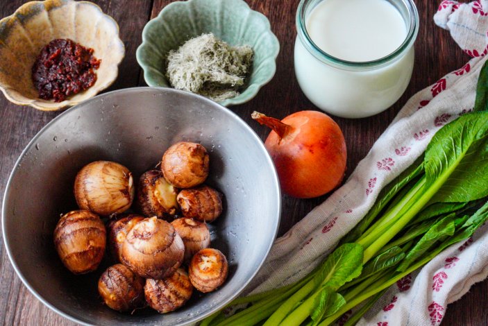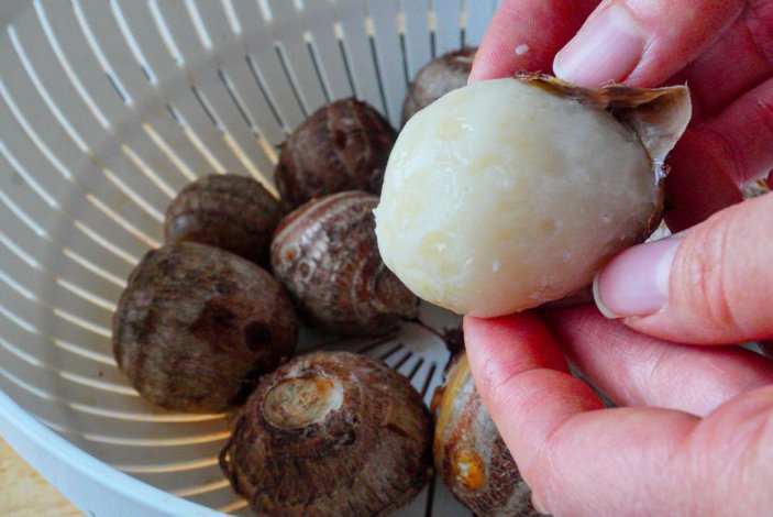 ・里芋はよく洗い、皮つきのまま蒸すまたは茹でる。