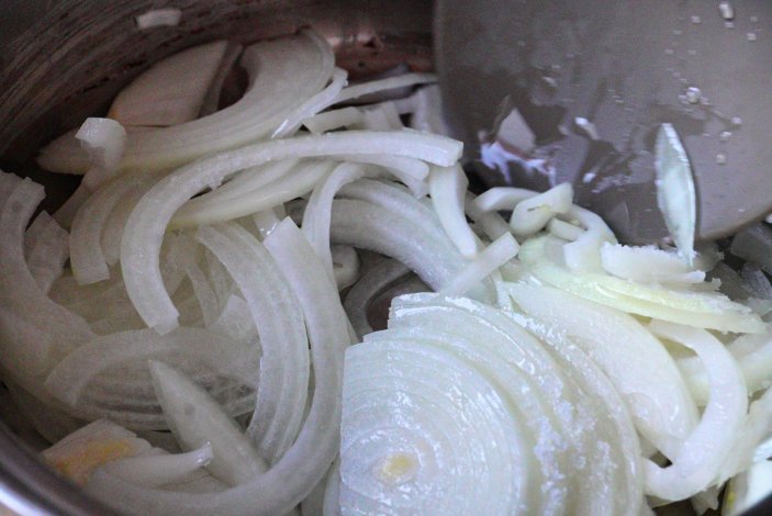 ・鍋に油と玉ねぎ、塩少々を入れ、弱めの中火でじっくり炒める。