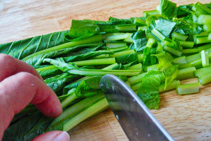 3.小松菜をカットする。小松菜は火が通りやすいよう、ざく切りにしておきます。